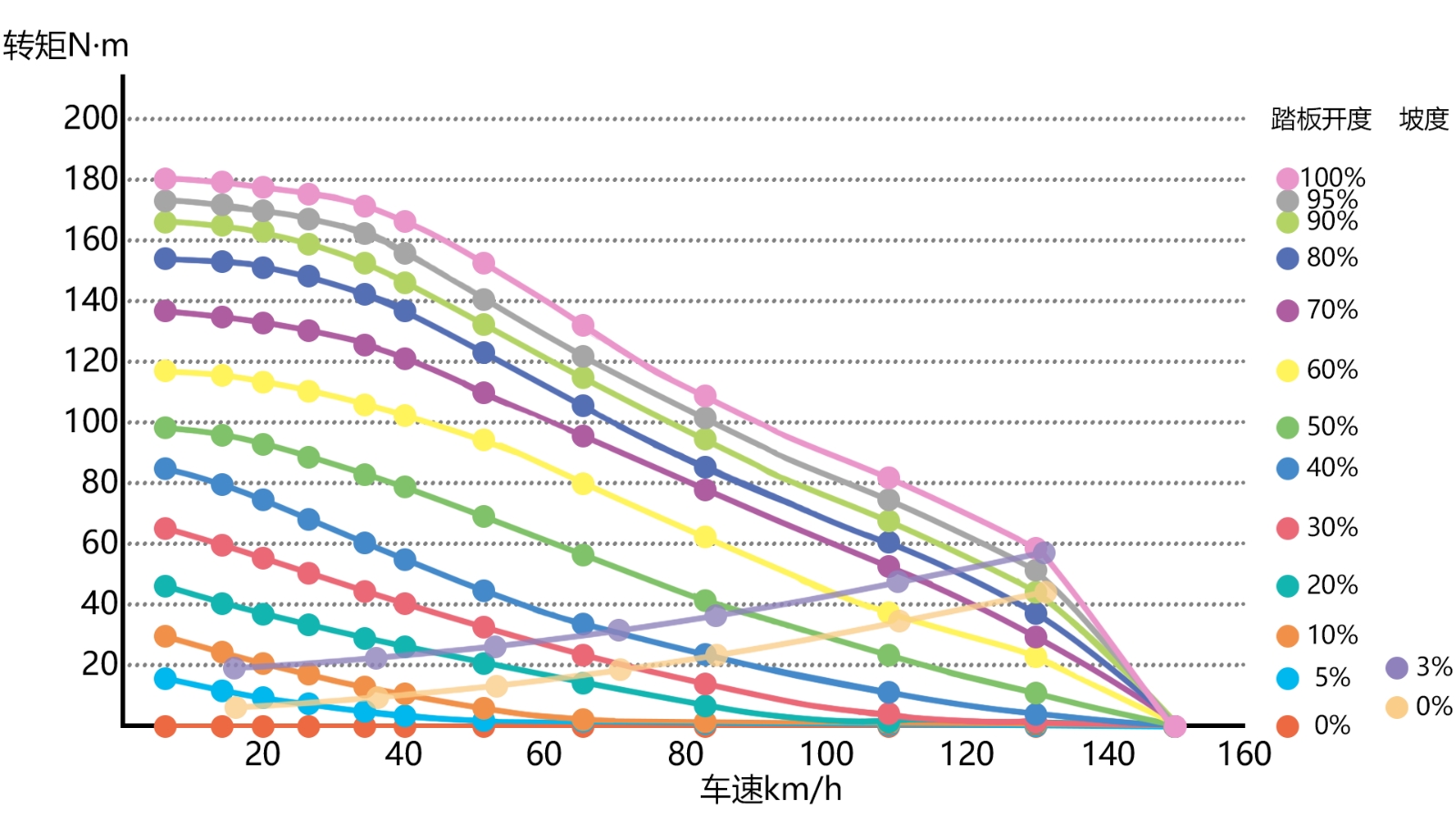 这里主要标定在不同车速下,踩下加速踏板后获得的动力响应和迟滞情况,其中所获得的加速感与加速踏板开度有关,以半开和全开为标准。如下图所示,横坐标为车速,纵坐标为扭矩,随车速下降的曲线为加速踏板各开度情况下的转矩输出曲线,随车速上升的曲线坡度为0% 时和坡度为 3% 时的车辆阻力曲线。