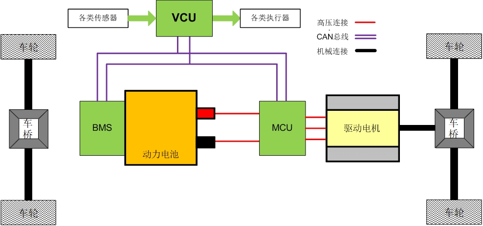 新能源汽车三电控制系统,包括整车控制器VCU(Vehicel Control Unit,),电机控制器MCU(Motor Control Unit)和电池管理系统BMS(Battery Management System)。
