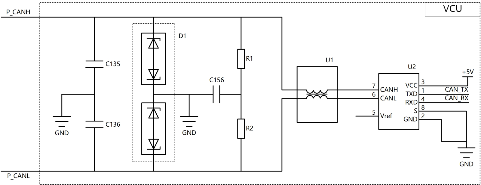 图中D1为TVS二极管,U1为共模滤波器(可选),U2为CAN收发器。
