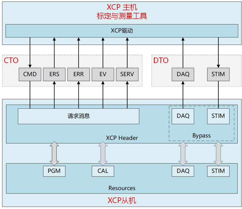 XCP采用一主多从的通信模式,单个主机可以同时与多个从机通信。主机通过下发命令与从机建立连接,解锁,读取数据,修改参数等操作,以"XCP数据包”的数据对象形式传输。XCP数据包有两种类型:命令传输对象(CTO:Command Transfer Object)和数据传输对象(DTO:Data Transfer Object)。