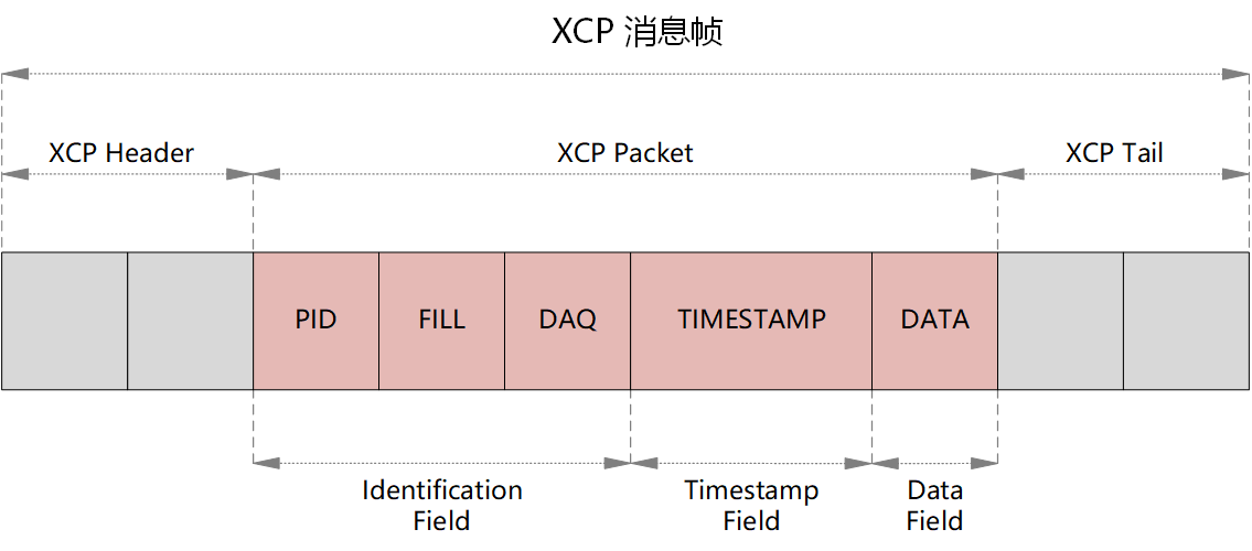 XCP Packet属于协议层内容,其中分为认证域(Identification Field)、采样时间域(Timestamp Field)和数据域(Data Field)。