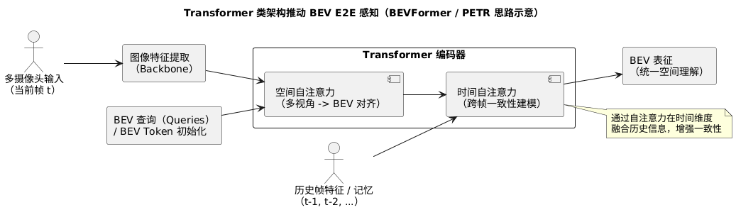 Transformer 类架构(如 BEVFormer、PETR)推动了 BEV E2E 感知的进一步普及,依靠自注意力机制在时间维度构建一致性的空间理解。
