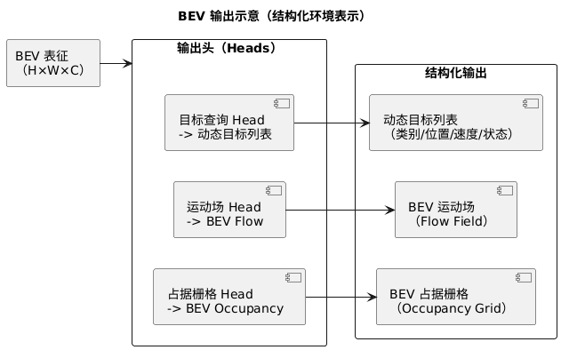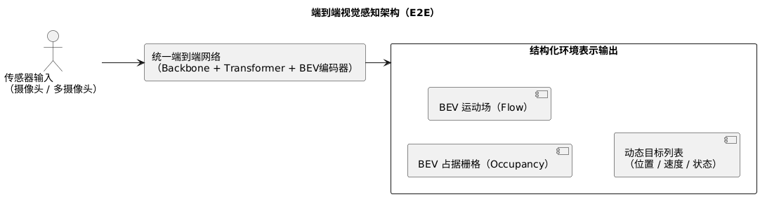 E2E 的目标是让网络直接输出结构化环境表示,例如 BEV Occupancy、BEV Flow 或动态对象列表。