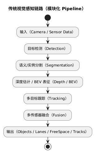 传统感知链路包括:检测 → 分割 → 深度 / BEV → 跟踪 → 融合