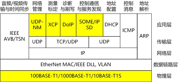 黄底区域:汽车以太网特有协议,主要分布在应用层,用于车载特定功能。
