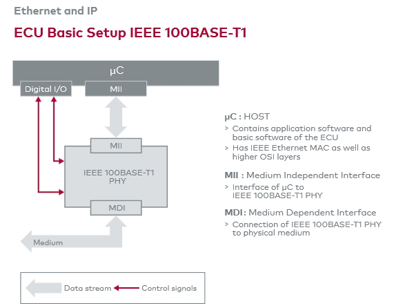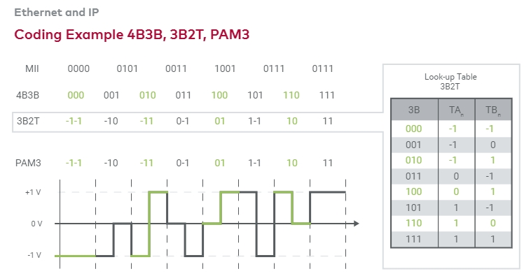 双绞线传输对称差分电压,用于表示编码符号。发送方基于所需的位流对符号进行编码。接收方对符号流解码,从而复原发送的位。与IEEE 100BASE-T1不同,IEEE 100BASE-TX通过使用NRZI、4B5B和MLT-3方法进行编码和解码以及生成差分电压。这些方法由IEEE 100BASE-TX PHY实现,集成在ECU的一个特定模块中。PHY在物理介质和以太网控制器之间建立连接。