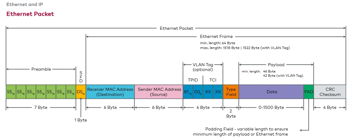 有效负载:在字段类型之后,是Ethernet II帧包含的有效负载数据区域。有效负载的最小长度为46个字节(不含VLAN标签)或42个字节(含VLAN标签)。在汽车行业中,有效负载一般最多可包含1500个字节。