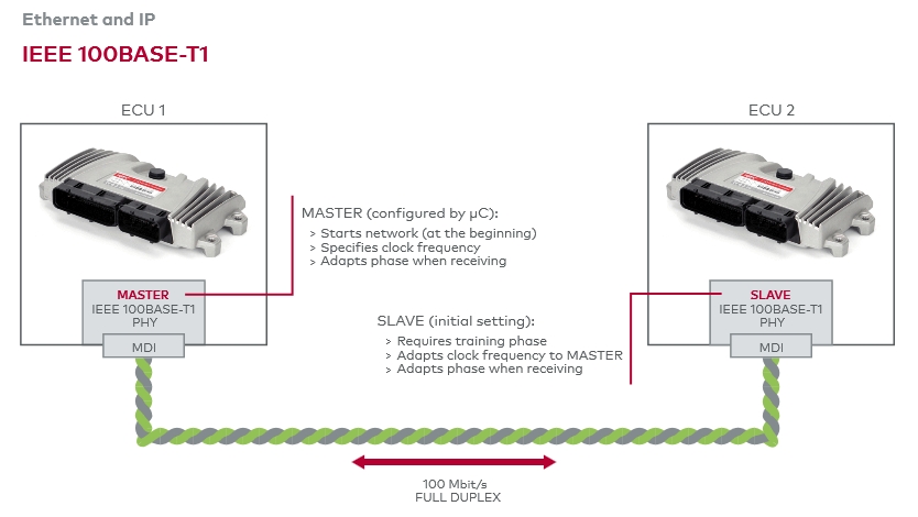 下图展示了基于 100BASE-T1 的两 ECU 点对点连接示例。与传统以太网使用两对双绞线相比,汽车以太网仅需一对双绞线即可实现全双工通信,从而减少线束数量、降低成本和重量。