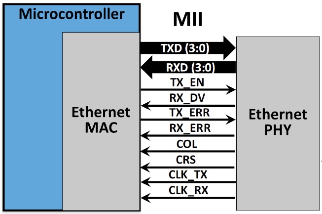 MII(Media Independent Interface,媒体独立接口)是连接以太网 MAC 和 PHY 的标准接口。MAC 侧通过 MII 将数据帧发送给 PHY,PHY 再将其转换为物理层信号并传输到网络中;反之,外部节点发送的数据也会先被 PHY 解调,再交由 MAC 处理。MII 由 IEEE 802.3 标准定义,可支持 10 Mb/s 与 100 Mb/s 的传输速率,数据传输位宽为 4 bit。“媒体独立”意味着在不改变 MAC 设计的前提下,可以灵活选用不同类型的 PHY 芯片。依据协议规范,一个 MAC 最多可管理 32 个 PHY 设备。
