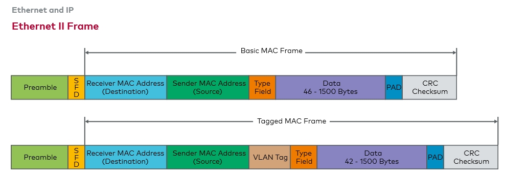 数据链路层规范了以太网帧结构,IEEE规范定义了不同格式的以太网帧:Ethernet II帧与IEEE-802.3帧。汽车行业通常使用Ethernet II帧,包含可以标志VLAN的扩展信息。因此,可以把以太网帧划分为基本MAC帧(不含VLAN)和标识MAC帧(包含VLAN)。