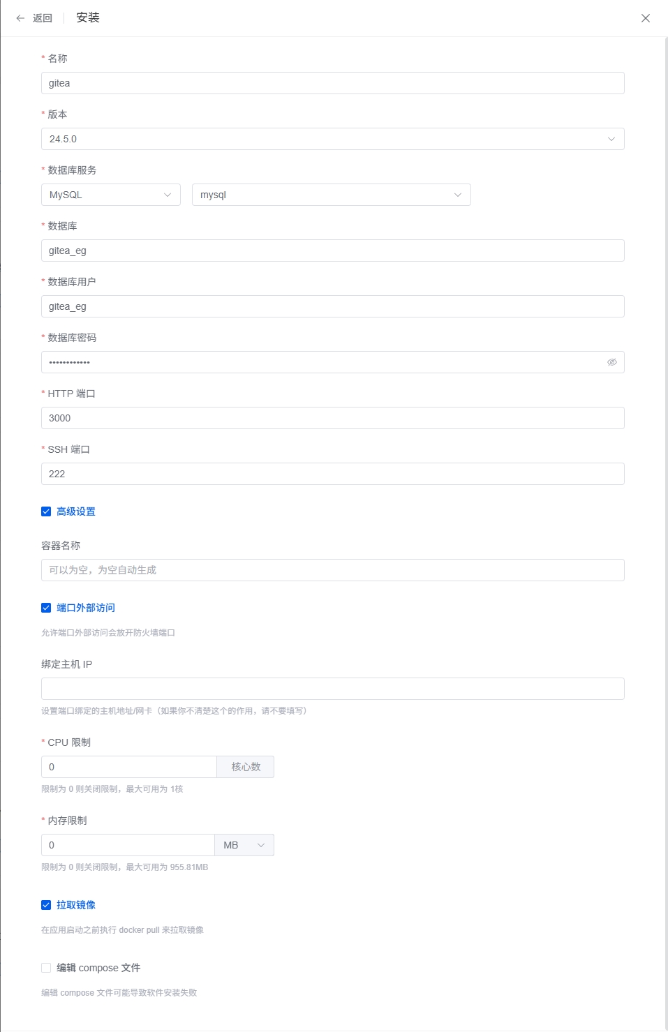 3000→ 仅内网访问或临时对外;后续建议通过 1Panel 站点反代到https://git.example.com/。SSH:容器
