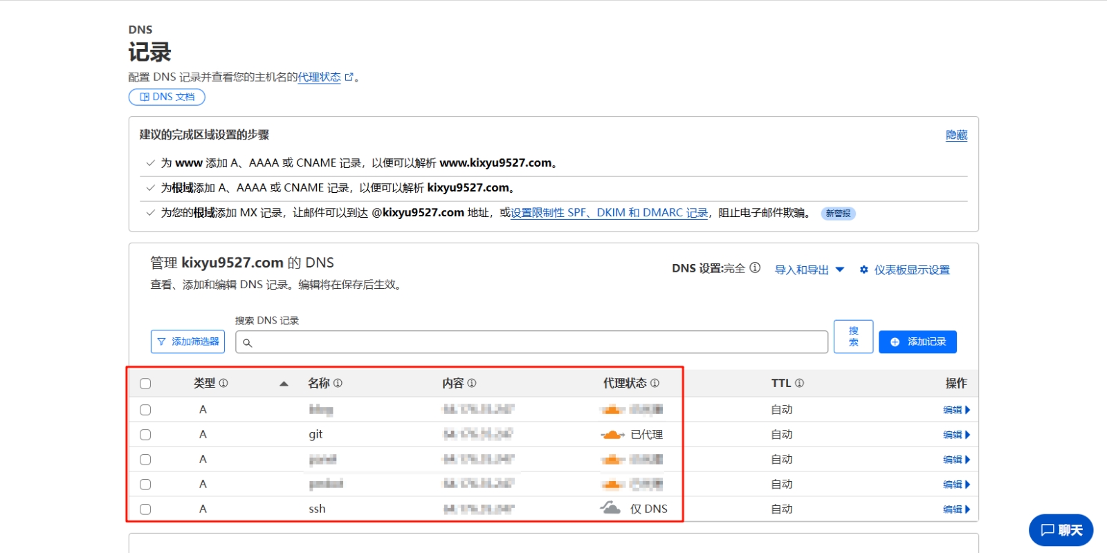 git.example.com→ 橙云(Proxied):给 Web 反代用。ssh.example.com→ 灰云(DNS only):Cloudflare 不代理这个 2222 端口,灰云直连你的服务器。