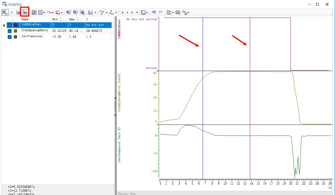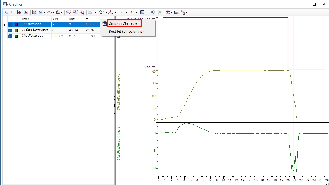 在图表左侧实时展示当前采样点信号值;通过右键图表标题,选择 Column Chooser 添加 Max、Min 等列,以查看信号在选定区间的极值。