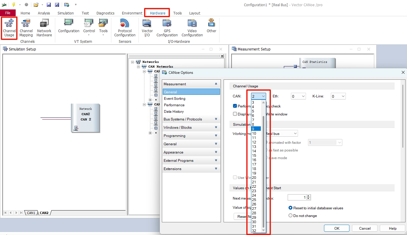 返回 Channels 设置页,为各通道加载对应的 DBC 文件;如需更多通道,可在 Channel Usage 中根据回放或仿真需求增加通道数。