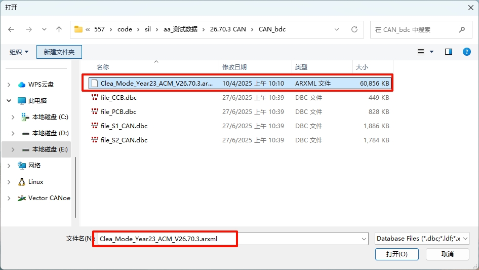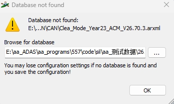 启动 Canoe 时,若弹出“未找到 Database”提示,需要在对话框中定位项目所用的 ARXML 或 DBC 配置文件,然后点击“OK”继续加载。