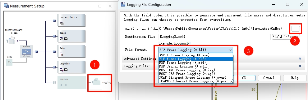 在 Logging 选项卡中配置文件名、格式(BLF、MAT、CSV)和存储路径,即可将当前回放数据导出。