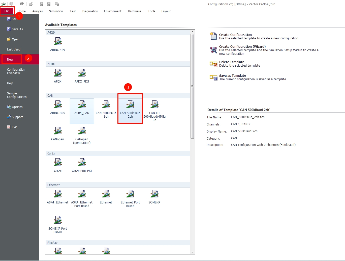 在主界面左上角依次选择 File → New → CAN 500 2ch,新建一个基于 ISO CAN FD (Flexible Data‑Rate)的双通道工程。
