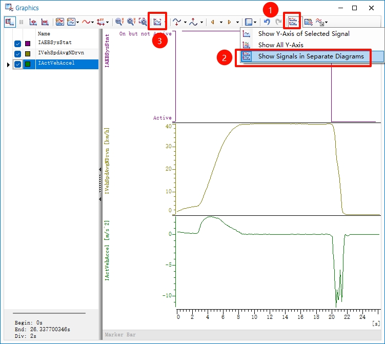 使用 Show Signals in Separate Diagrams 功能,将每个信号绘制在独立坐标系;然后点击 Fit All Signals 自动调整纵轴范围,保证曲线清晰可见。