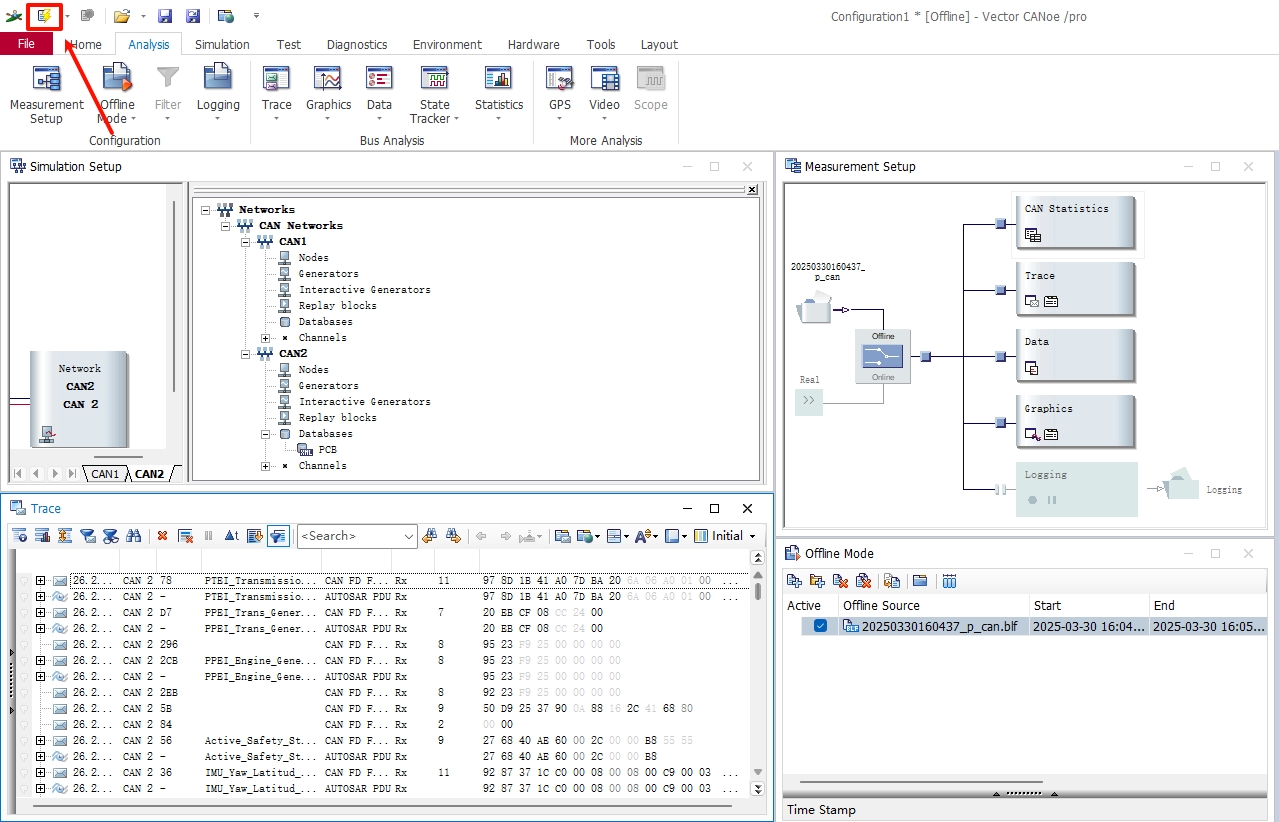 在左侧选择 Offline 模式,右键点击文件夹节点,选择 Add,在弹出的 Offline Mode 对话框中添加 BLF、CSV 或其他支持的回放文件。