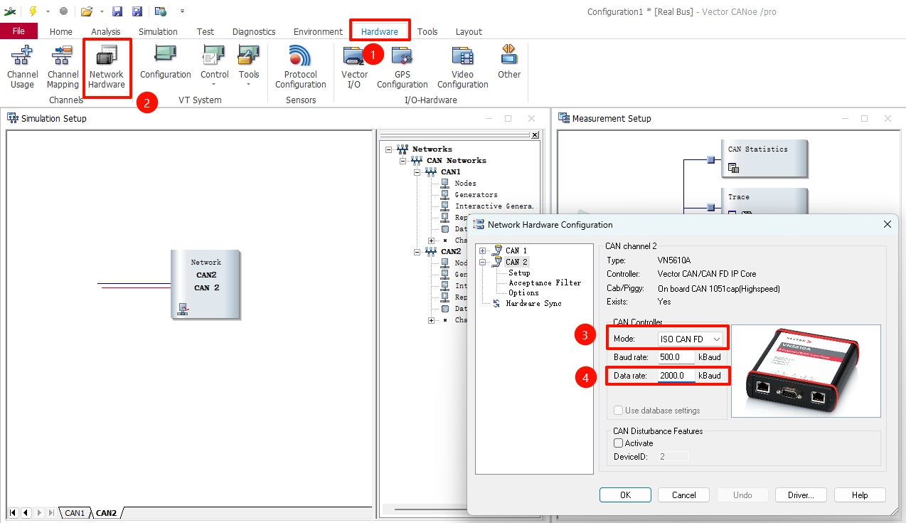 在开始使用 Canoe 之前,需要先将 VN5610A 硬件设备通过 USB 连接到电脑,并确保已安装对应驱动。