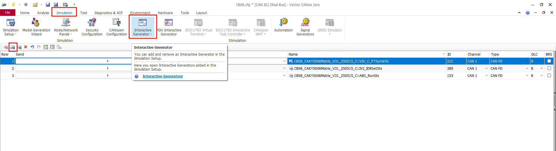 在主界面导航栏中选择 Simulation → Interactive Generator,进入交互式报文发送界面。点击 Send Add CAN FD Frame,即可创建并配置需要发送的报文。