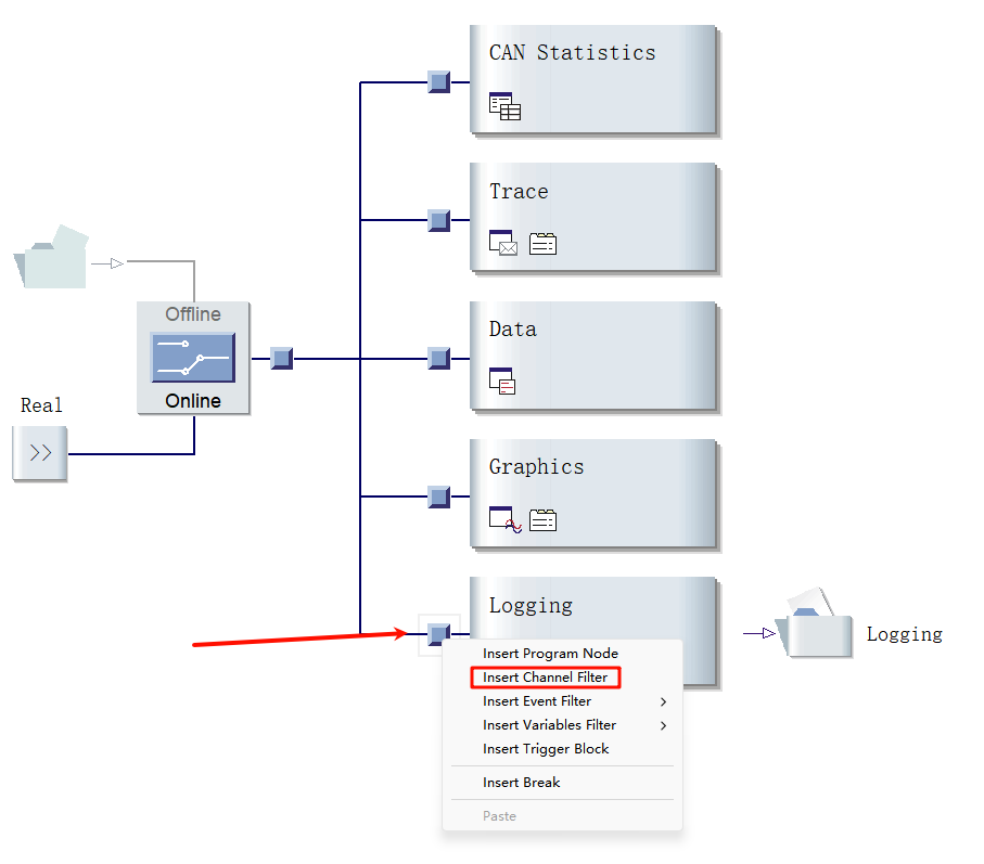 右键蓝色小方块选择 Insert Channel Filter 可以配置只录制某一路 can 。
