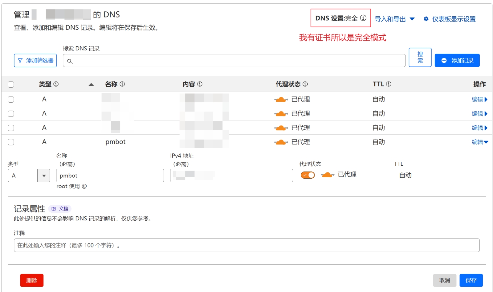 Proxied(橙云):开启(推荐开启以启用 DDoS 防护和 CDN 加速)