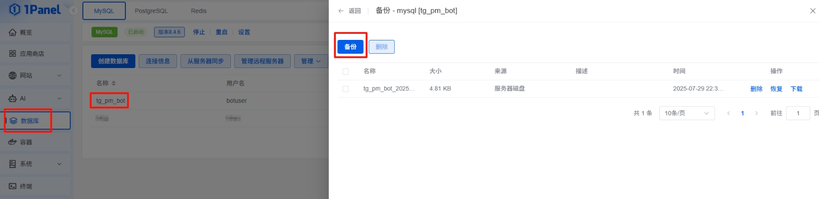 在左侧的选项中点击数据库,找到对应的数据库,然后选择右侧的备份列表,点击备份后下载该文件。