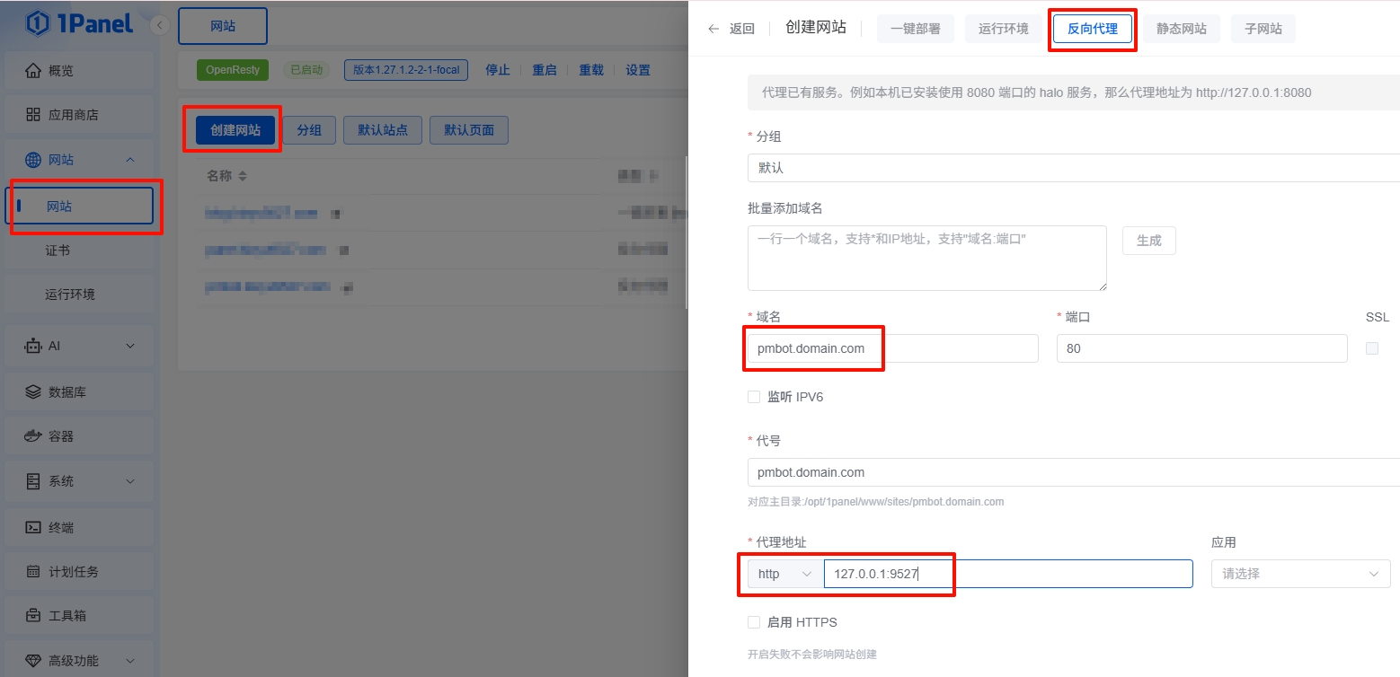 pmbot.your-domain.com(全名)。协议:HTTP(1Panel 将接收 HTTP 请求并转发)。